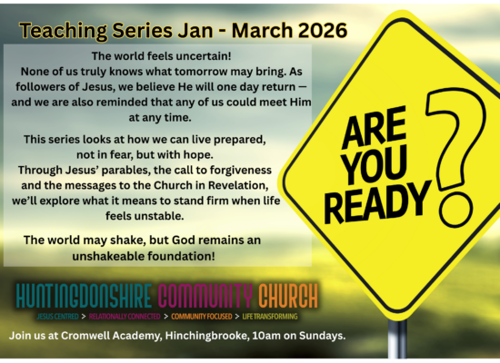 Are You Ready? We’d love you to join us for this new teaching series! Details as above. We meet at Cromwell Academy School in Hinchingbrooke, PE29 6JA. 10am on Sundays.